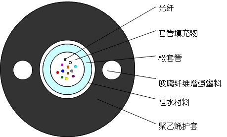 GYFXY光纜的結(jié)構(gòu)是將250µm光纖套入高模量材料制成的松套管中,松套管內(nèi)填充防水化合物。松套管外加阻水材料以保證光纜縱向阻水,兩側(cè)放置兩根平行玻璃纖維增強(qiáng)塑料(FRP)后擠制聚乙烯護(hù)套成纜。